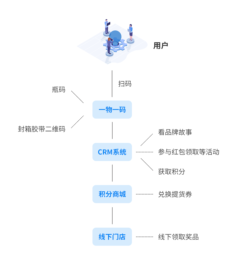 以往B端、C端各自為戰(zhàn)的單點營銷戰(zhàn)略已經(jīng)無法適應(yīng)快速迭代升級的消費模式。國立信科以碼為紐帶,基于一物一碼數(shù)字化營銷系統(tǒng)實現(xiàn)BC一體化聯(lián)動營銷(經(jīng)銷商+業(yè)務(wù)員+門店+C端);推動用戶復(fù)購,建立品牌私域流量、打通線上、線下、社群的“三度空間”,利用數(shù)字化方式,在線調(diào)動用戶,反向激勵B端,B端線下引導(dǎo)C端,全面實現(xiàn)“企業(yè)與客戶連接”的營銷閉環(huán)。
